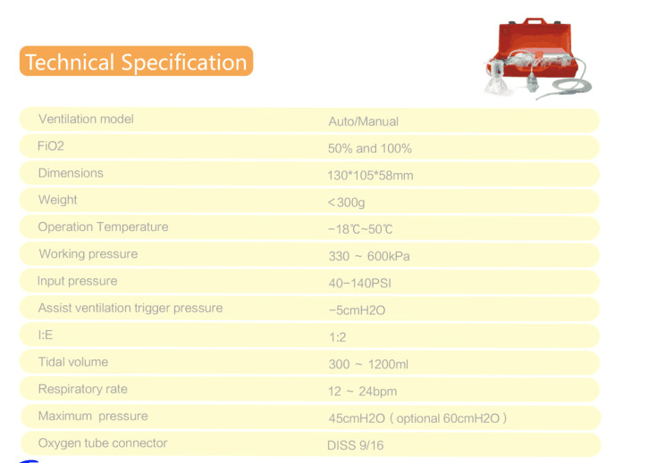 *Equipped with engineered ABS plastic, sturdy and portable box. Its very handy, can operate with single hand for cardiopulmonary resuscitation in emergency. Multiple Oxygen concentration options. Respiratory rate and tidal volume can be constantly adjusted.